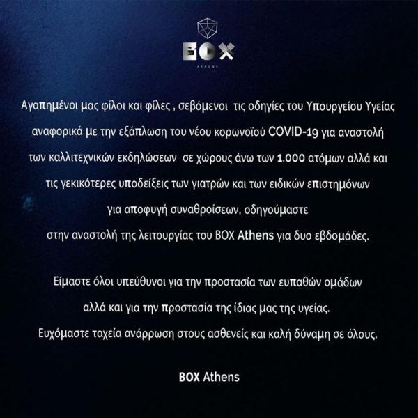 Θυμίζουμε ότι ήδη έχει δοθεί σύσταση για αναστολή των πολιτιστικών και καλλιτεχνικών εκδηλώσεων σε κλειστούς και ανοιχτούς χώρους που περιλαμβάνουν πάνω από 1.000 άτομα.