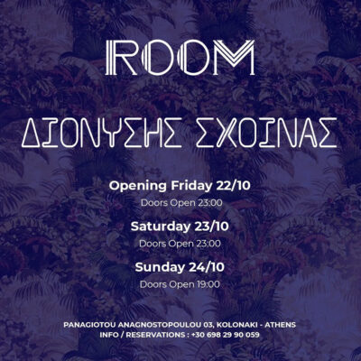 Ο Διονύσης Σχοινάς βάζει για ακόμα μία χρονιά τη μοναδική σφραγίδα του στη νυχτερινή ζωή της Αθήνας και μας δίνει ραντεβού στο ολοκαίνουργιο hot spot, το «Room», από την Παρασκευή 22 Οκτωβρίου και κάθε Παρασκευή και Σάββατο στις 23:00 και Κυριακή στις 19:00.