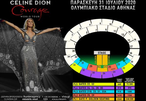 Η ιέρεια της pop, η λαμπερή Celine Dion, έρχεται στη χώρα μας στις 31 Ιουλίου 2020 στο πλαίσιο της παγκόσμιας περιοδείας της, COURAGE WORLD TOUR φέρνοντας στις αποσκευές τις αγαπημένες μας επιτυχίες καθώς και το νέο ομώνυμο άλμπουμ της.