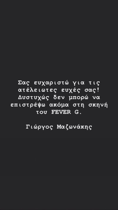 Έτσι, το απόγευμα του Σαββάτου ο Γιώργος Μαζωνάκης μέσα από τον προσωπικό του λογαριασμό στο Instagram ενημέρωσε τους διαδικτυακούς του φίλους πως θα έπρεπε να παραμείνει και δεύτερη μέρα εκτός των επαγγελματικών του υποχρεώσεων.