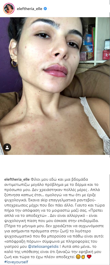 Χαρακτηριστικά, έγραψε:“Φίλοι μου εδώ και μια βδομάδα αντιμετωπίζω μεγάλο πρόβλημα με το δέρμα και το πρόσωπο μου. Δεν χρειάστηκαν πολλές μέρες . Απλά ξύπνησα κάπως έτσι… ομολογώ να πω ότι με έριξε ψυχολογικά. Έκανα skip επαγγελματικά ραντεβού- υποχρεώσεις μέχρι που δεν πάει άλλο. Γι’ αυτό και τώρα πήρα την απόφαση να το μοιραστώ μαζί σας. «Πρέπει απλά να το αποδεχτώ» . Δεν είναι αλλεργικό – είναι ψυχολογική πίεση που μου έσκασε στην επιδερμίδα. (Πήρα το μήνυμα μου, δεν χρειάζεται να αγχωνόμαστε για ασήμαντα πράγματα στην ζωή) το λιγότερο ψυχοσωματικό που θα μπορούσα να πάθω είναι αυτό: «απόφραξη πόρων» σύμφωνα με πληροφορίες του γιατρού μου! Αυτά από μένα.. το καλό της υπόθεσης είναι ότι ξαναζώ την εφηβική μου ζωή και τώρα το έχω πλέον αποδεχτεί!”