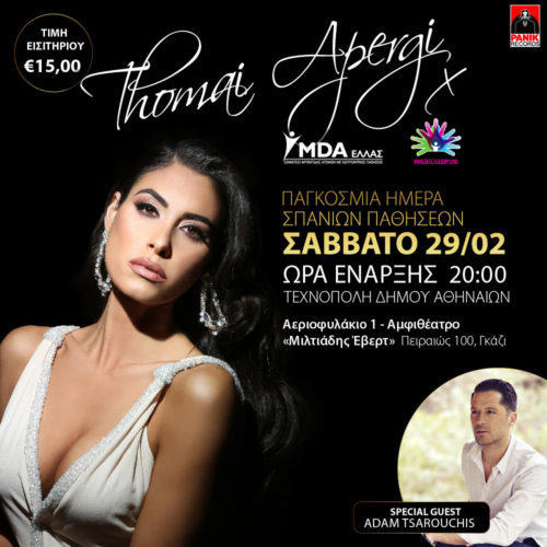Με αφορμή την Παγκόσμια Ημέρα Σπανίων Παθήσεων, στις 29 Φεβρουαρίου 2020 και με πρωτοβουλία της Thomai Apergi Entertainment σε συνεργασία με την Panik Records, διοργανώνεται μία μουσική βραδιά με τη Θωμαή Απέργη και την μπάντα της αφιερωμένη στο MDA ΕΛΛΑΣ – Σωματείο για τη Φροντίδα των Ατόμων με Νευρομϋικές Παθήσεις.