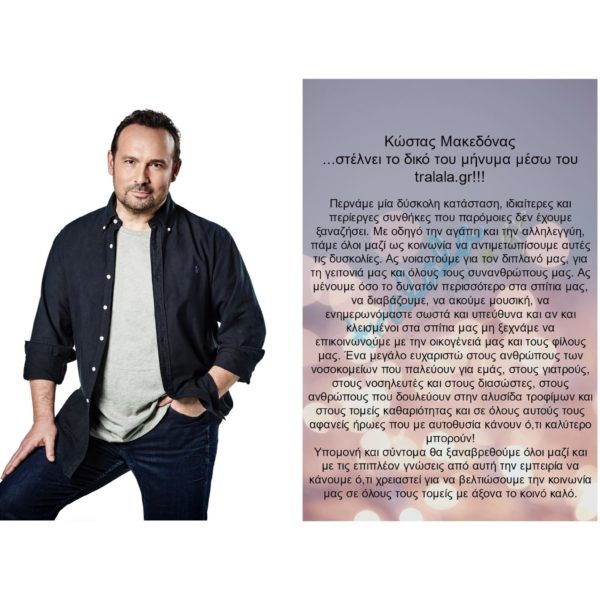 Ένας ακόμη πολύ αγαπημένος τραγουδιστής, ο Κώστας Μακεδόνας, δηλώνει δυναμικό παρόν και μέσω του πιο δημοφιλούς ελληνικού μουσικού portal, του tralala.gr, μοιράζεται με το κοινό τις σκέψεις του για την πανδημία, τις συνέπειές της και την δύσκολη κατάσταση που καλούμαστε να διαχειριστούμε.