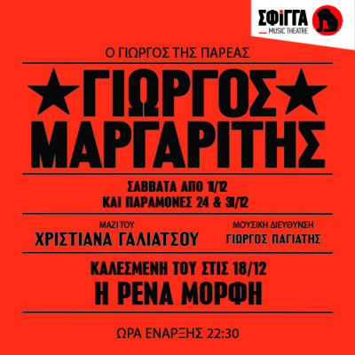 Ο Γιώργος Μαργαρίτης, «της παρέας και του καλού τραγουδιού» θα συνεχίζει τις μουσικές του παραστάσεις κάθε Σάββατο για περιορισμένο αριθμό, αλλά και τις παραμονές Χριστουγέννων (24/12) και Πρωτοχρονιάς (31/12) στη μουσική σκηνή Σφίγγα. Ο πηγαίος ερμηνευτής έρχεται στη μουσική σκηνή της Αθήνας για μια σειρά ξεχωριστών εμφανίσεων πλημμυρισμένες από σπουδαίες στιγμές, συλλεκτικές μουσικές συνευρέσεις και με μοναδικούς συνεργάτες.