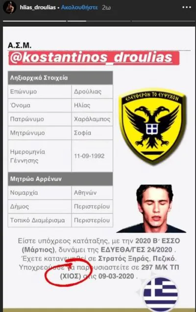 Έτσι, ο Ηλίας Ντρούλιας δημοσίευσε το ειδοποιητήριο που δέχθηκε από τον Ελληνικό Στρατό, καθώς τον Μάρτιο θα παρουσιαστεί στη Χίο.