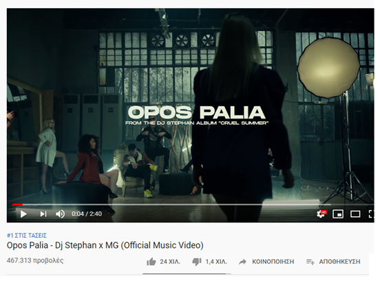 Το official video του νέου single του παραγωγού των hit Dj Stephan και του χαρισματικού MG με τίτλο «Opos Palia» βρίσκεται στο Νο1 των YouTube Trends εδώ και λίγα εικοσιτετράωρα, αγγίζοντας σχεδόν τις 500.000 προβολές μέσα σε μόλις 4 μέρες.
