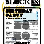 Το Σάββατο 28 και την Κυριακή 29 Αυγούστου ο πολυχώρος πολιτισμού BLOCK 33 γιορτάζει τον ένα χρόνο λειτουργίας του και σας καλεί στο πρώτο πάρτι του με αγαπημένες μπάντες στη σκηνή και μουσικούς παραγωγούς πίσω από τα πικάπ… Μια ευκαιρία για συνάντηση, επικοινωνία και διασκέδαση..