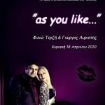 Η Φιλιώ κι ο G, για μία μοναδική βραδιά στην Αυλαία, αγγίζουν κάτι απ’ το άρωμα της Gilda και της Φαίδρας, νοσταλγούν με τα λόγια της Νικολακοπούλου και της Barbra Streisand και τζαζάρουν με τη διάθεση του Πλέσσα και της Loreena Mckennitt. Με τον τρόπο που σας αρέσει, μας περνάνε μέσα από “εκλείψεις” της δεκαετίας του ’80, ακροβατώντας σε ροκ ήχους, για να μας θυμίσουν πως η παράσταση δε σταματά ποτέ. “as you like…”