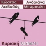 O Κώστας Λειβαδάς και η Ανδριάνα Μπάμπαλη μία σχέση που δοκιμάστηκε μουσικά με επιτυχία τα τελευταία χρόνια, ένα ζευγάρι που μας έχει συνηθίσει στα ασυνήθιστα ανεβαίνουν στη σκηνή του Almaz, την Κυριακή 3 Απριλίου για μία δυνατή, φιλική και ανοιξιάτικη μουσική παράσταση.