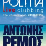Μετά από 3 ολόκληρα χρόνια απουσίας ο Αντώνης Ρέμος επιστρέφει στην αγαπημένη του πατρίδα, στην Θεσσαλονίκη. Σε ένα γνώριμο χώρο, αυτόν του Πολιτεία Live Clubbing, θα παρουσιάσει ένα μοναδικό πρόγραμμα γεμάτο από τις μεγαλύτερες επιτυχίες του, παλιά αγαπημένα τραγούδια αλλά και τα τραγούδια της τελευταίας του δισκογραφικής δουλειάς με τίτλο «Αλήθειες και ψέματα» που έγιναν πολύ μεγάλες επιτυχίες όπως το «Τέρμα η ιστορία», «Έχω εσένα», «100 φορές κομμάτια», «Μέχρι το τέλος του κόσμου», «Ποτέ», «Φτάνει που ξέρω», ένα μεστό πρόγραμμα που αναμένεται να γνωρίσει την ίδια επιτυχία με αυτήν που γνώρισαν οι «Ιστορίες Αγάπης» στο Διογένης Studio τον χειμώνα που πέρασε (80.000 θεατές).