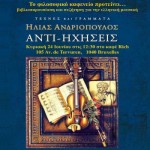 Ο μουσικοσυνθέτης Ηλίας Ανδριόπουλος θα βρεθεί για πρώτη φορά στις Βρυξέλλες στο χώρο του De Lijsterbes Théâtre, όπου θα παρουσιάσει το νέο του βιβλίο με τίτλο «ΑNTI-ΗΧΗΣΕΙΣ». Ο Ηλίας Ανδριόπουλος θα μιλήσει για το έργο του, τη θέση και το χαρακτήρα της μουσικής του, αλλά και της νεοελληνικής μουσικής σε σχέση με την ευρύτερη μουσική παράδοση της περιοχής μας και της Ευρώπης γενικότερα.