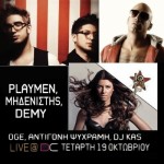 Την Τετάρτη 19 Οκτωβρίου το DC φιλοξενεί μια σειρά από καλλιτέχνες: Playmen, Μηδενιστής, Demy, Oge και Αντιγόνη Ψυχράμη και DJ Kas. Ο Ρυθμός 9.49 ετοιμάζει ένα ακόμη πάρτι που θα μείνει αξέχαστο.