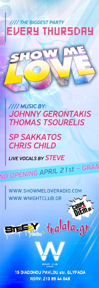Για τρίτη χρόνια το show me love party συνεχίζεται και σας υπόσχεται αξέχαστες νύχτες διασκέδασης, sexy dancers, many happenings και ξεφάντωμα σε ρυθμούς house k rnb μουσικής! Aν είστε έτοιμοι να ζήσετε την έννοια της λέξης party σας περιμένουμε σε ναό χώρο υψηλής αισθητικής και prive ατμόσφαιρας στο W CLUB POOLSIDE DREAMS.