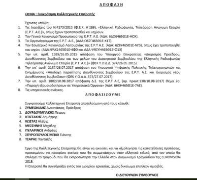 Με απόφαση του διευθύνοντα συμβούλου της ΕΡΤ Βασίλη Κωστόπουλου, που αναρτήθηκε και στο διαδίκτυο πριν από λίγο, συστάθηκε η καλλιτεχνική επιτροπή που θα αξιολογήσει τα τραγούδια που θα κατατεθούν από τις δισκογραφικές εταιρείες για τη Eurovision 2018 και θα προκρίνει αυτά που θεωρεί κατάλληλα να διαγωνιστούν στον εθνικό τελικό. Σύμφωνα με την απόφαση που για άλλη μία φορά το INFEGREECE σας παρουσιάζει πρώτο, φαίνεται ξεκάθαρα η απόφαση της διοίκησης της εταιρείας για διοργάνωση εθνικού τελικού μέσω του οποίου θα αναδειχθεί ο εκπρόσωπος μας για τη Λισαβόνα. Πρόεδρος της επιτροπής ορίστηκε ο μαέστρος Αναστάσιος Συμεωνίδης.