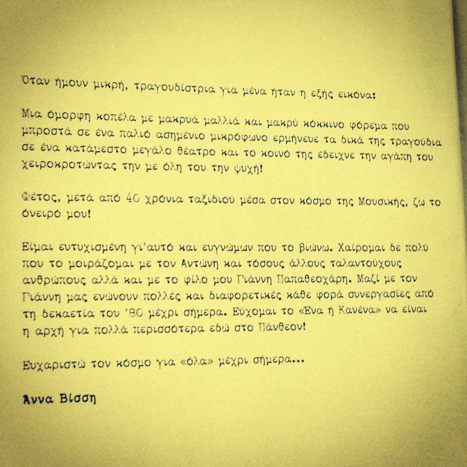 Είμαι ευτυχισμένη γι’αυτό και ευγνώμων που το βιώνω. Χαίρομαι δε πολύ που το μοιράζομαι με τον Αντώνη και με τόσους άλλους ταλαντούχους ανθρώπους, αλλά και με τον φίλο μου Γιάννη Παπαθεοχάρη, Μαζί με τον Γιάννη μας ενώνουν πολλές και διαφορετικές κάθε φορά συνεργασίες από τη δεκαετία του ’80 μέχρι σήμερα. Εύχομαι το «Ένα ή Κανένα» να είναι η αρχή για πολλά περισσότερα εδώ στο Πάνθεον!