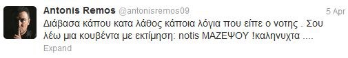 Συγκεκριμένα, την Παρασκευή 5 Απριλίου παρατηρήσαμε κάτι ιδιαίτερο στον προσωπικό λογαριασμό του Αντώνη Ρέμου στο twitter. Ο ταλαντούχος ερμηνευτής φαίνεται να ενοχλήθηκε με κάτι που άκουσε από το στόμα του Νότη Σφακιανάκη και αμέσως έσπευσε να πει την γνώμη του στον ίδιο μέσω twitter. Θα λέγαμε πως τον “συμβούλεψε” λέγοντάς του το εξής: “Διάβασα κάπου κατά λάθος κάποια λόγια που είπε ο Νότης. Σου λέω μια κουβέντα με εκτίμηση: ΜΑΖΕΨΟΥ! Καληνύχτα”.
