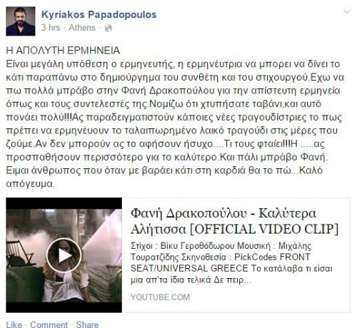 Με ένα εκτενές post στο facebook πασίγνωστος συνθέτης μιλά με τα καλύτερα λόγια για την τραγουδίστρια Φανή Δρακοπούλου και το ολοκαίνουριο τραγούδι της “Καλύτερα Αλήτισσα”, χαρακτηρίζοντας μάλιστα την ερμηνεία της ως την “απόλυτη ερμηνεία”.