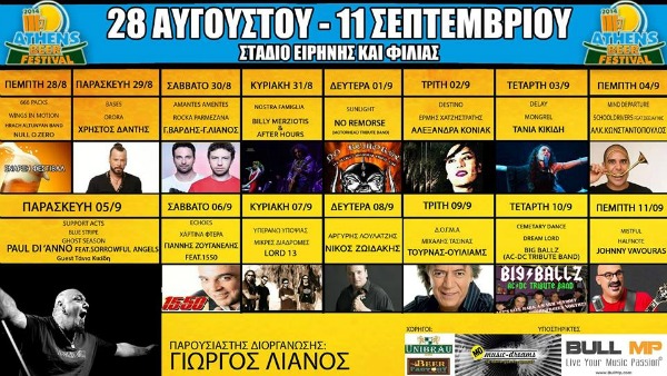 Πρωτεύοντα ρόλο στην διασκέδαση των επισκεπτών παίζει το Μουσικό Πρόγραμμα του Φεστιβάλ. Μεγάλα ονόματα της Ελληνικής αλλά και ξένης μουσικής σκηνής, ταλαντούχοι νέοι καλλιτέχνες και μπάντες που αξίζει να προβληθούν, θα εμφανιστούν στις 15 ημέρες που διαρκεί το Athens Beer Festival.