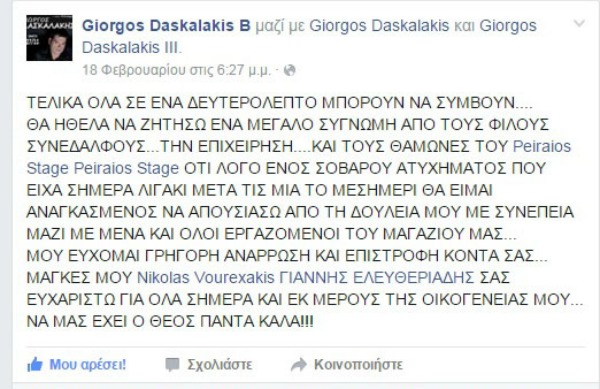 Μέσα στην ατυχία του ο Γιώργος Δασκαλάκης στάθηκε τυχερός, αφού δεν χτύπησε περισσότερο στο κεφάλι, χάνοντας όμως τρία μπροστινά δόντια. Όπως ο ίδιος ο Ροδίτης τραγουδιστής ανακοίνωσε το ατύχημά του μέσω του προσωπικού λογαριασμού του στο Facebook, θέλησε να ζητήσει συγγνώμη από τους εργαζόμενους του νυχτερινού κέντρου «Πειραιώς stage» όπου εμφανίζεται αλλά και τους θαμώνες, αφού λόγω του ότι χτύπησε πολύ, και έχριζε άμεσης ανάγκης εμφυτευμάτων δοντιών, δεν μπορούσε να εμφανιστεί στην πίστα.