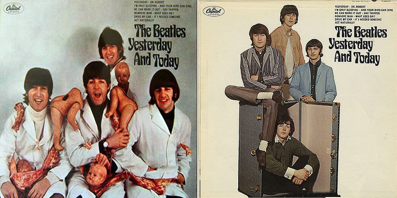 Ξεκινάμε με ένα από τα πιο γνωστά απαγορευμένα εξώφυλλα, που έχει μείνει στην ιστορία ως το “Bucher Baby” cover, αυτό του ιστορικού “Yesterday And Today” των Beatles. Τα σκαθάρια χρησιμοποίησαν για άλλη μια φορά το black humor που τους διακατείχε, και λόγω πλήξης σύμφωνα με τα λεγόμενα του John Lennon ήθελαν να κάνουν μια διαφορετική φωτογράφηση. Ο Paul McCartney ήταν αυτός που επέμενε να χρησιμοποιηθεί η εν λόγω φωτογραφία για εξώφυλλο του album, και λέγεται ότι η φωτογραφία τους ντυμένοι κρεοπώληδες με ακρωτηριασμένα μωρά ήταν το δικό τους ειρωνικό μήνυμα για το Πόλεμο του Βιετνάμ.