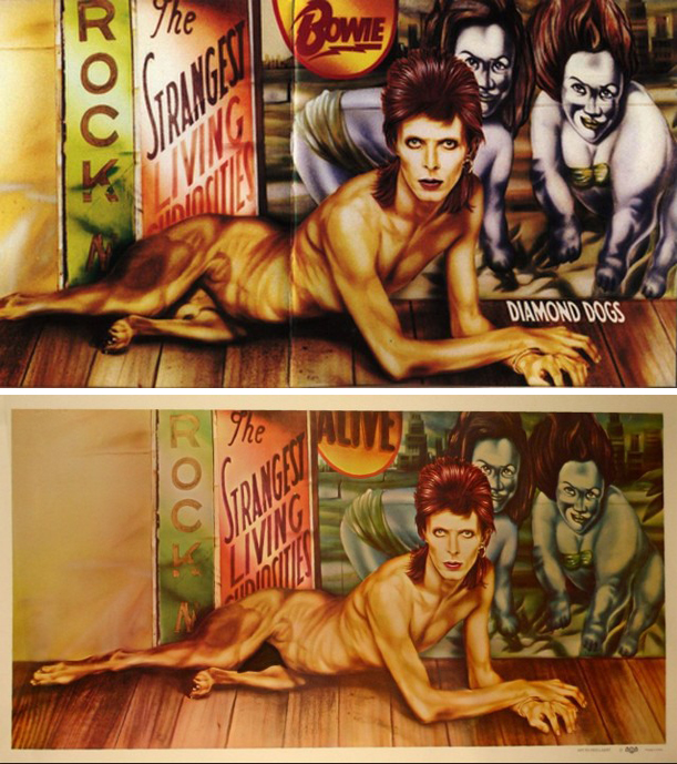 Για το “Diamond Dogs” o David Bowie εμφανίζεται μισός σκύλος μισός άνθρωπος. Μέχρι εδώ όλα βαίνουν καλά. Ο Bowie όμως θέλησε να έχει ολοκληρωμένη σκυλίσια μορφή, και στο πρωτότυπο cover διαγράφονται και τα γεννητικά όργανα που κάθε φυσιολογικός σκύλος διαθέτει.