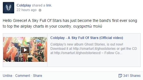 Στο Facebook μπήκαν οι Coldplay και έσπευσαν να ευχαριστήσουν την Ελλάδα και τους φανς τους. Για ποιο λόγο; Μα φυσικά επειδή το τραγούδι τους “A Sky Full Of Stars” είναι το #1 τραγούδι στα Ελληνικά ραδιόφωνα.