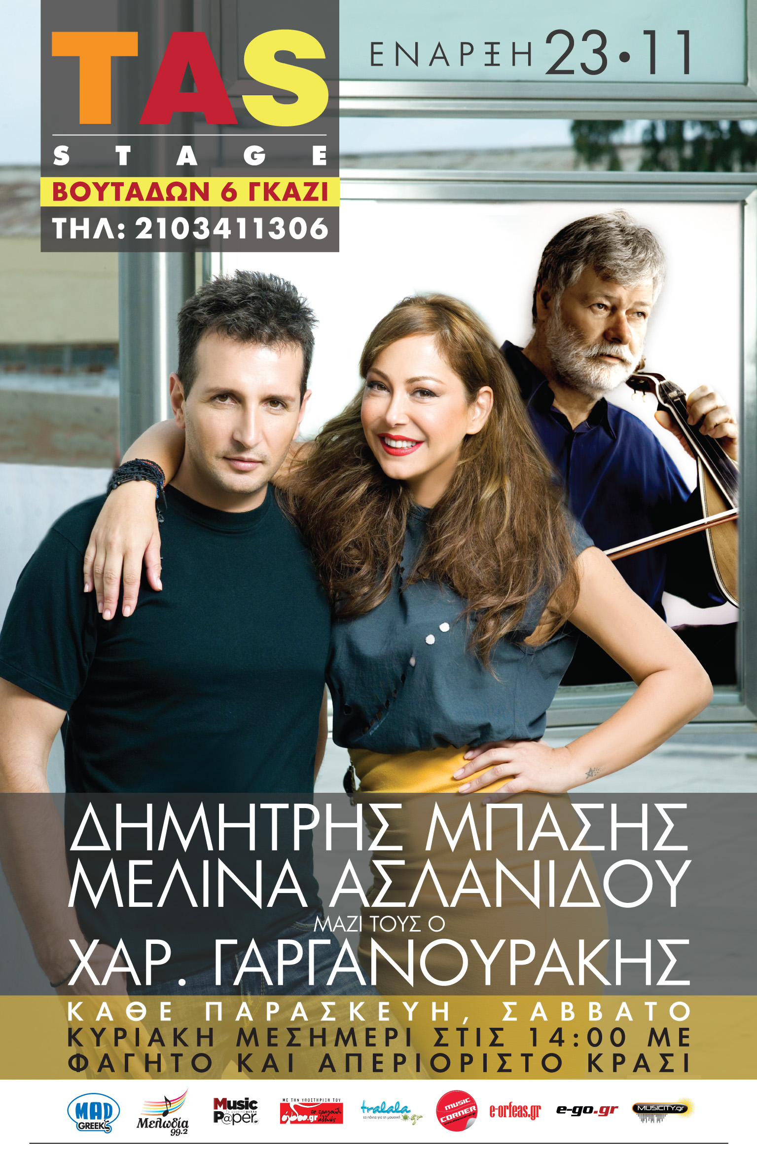 Δημήτρης Μπάσης, Μελίνα Ασλανίδου και Χαράλαμπος Γαργανουράκης στο Tas Stage από 23/11