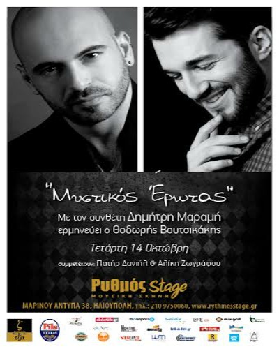 Ο συνθέτης – πιανίστας Δημήτρης Μαραμής, ο ερμηνευτής Θοδωρής Βουτσικάκης και ο ταλαντούχος πατήρ Δανιήλ μετά τις πετυχημένες sold out μουσικές παραστάσεις του Μυστικού Έρωτα που έδωσαν στο Μέγαρο Μουσικής Αθηνών (Πολυχώρο Φίλων της Μουσικής), στη Λωζάνη της Ελβετίας, στην Αθηναΐδα και στο Φεστιβάλ Σερίφου, εμφανίζονται στη μουσική σκηνή του Ρυθμού Stage την Τετάρτη 14 Οκτωβρίου. Μαζί τους συμμετέχουν η ερμηνεύτρια Αλίκη Ζωγράφου και ο σολίστ στο τσέλο Αλέξανδρος Μποτίνης.