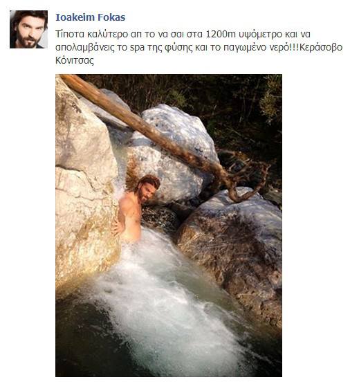 O Iωακείμ Φωκάς ανέβηκε μέχρι τον Κεράσοβο στα Ιωάννινα και δεν παρέλειψε να κάνει μια βουτιά στα πεντακάθαρα νερά του. Όπως ανέφερε και ο ίδιος στο σχόλιο που συνόδευε την όμορφη φωτογραφία, “Τίποτα καλύτερο απο το να να σαι στα 1200m υψόμετρο και να απολαμβάνεις το spa τηε φύσης και το παγομένο νερό!!!”.