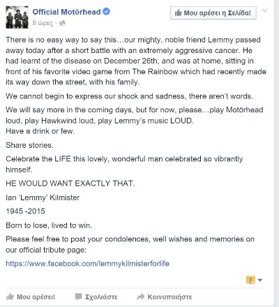 “Δεν υπάρχει εύκολος τρόπος για να το πούμε αυτό… Ο υπέρτατος, ευγενικός μας φίλος, ο Lemmy “έφυγε” νωρίτερα σήμερα, έπειτα από μια σύντομη μάχη με έναν εξαιρετικά επιθετικό καρκίνο. Έμαθε για την ασθένεια στις 26 Δεκεμβρίου και βρισκόταν σπίτι του, καθισμένος μπροστά στο αγαπημένο του video game από το Rainbow, το οποίο πρόσφατα είχε επισκεφτεί μαζί με την οικογένεια του. Δεν μπορούμε να εκφράσουμε το σοκ και την θλίψη μας, δεν υπάρχουν λέξεις.