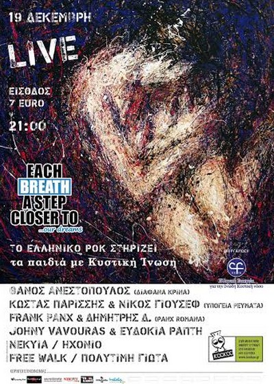 Η συναυλία θα πραγματοποιηθεί στα πλαίσια της καμπάνιας “Εach breath a step closer to our dreams”, μιας συντονισμένης ομαδικής δράσης ενημέρωσης για την νόσο της κυστικής ίνωσης, την σημασία του προγεννητικού ελέγχου, αλλά ταυτόχρονα και την οικονομική ενίσχυση των δράσεων του Πανελλήνιου Συλλόγου Κυστικής Ίνωσης. (www.cysticfibrosis.gr)