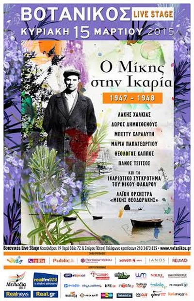 Η Λαïκή Ορχήστρα «Μίκης Θεοδωράκης» και οι: Λάκης Χαλκιάς, Δώρος Δημοσθένους, Μπέττυ Χαρλαύτη, Μαρία Παπαγεωργίου, Θεολόγος Κάππος, Πάνος Τσίτσος καθώς και το Ικαριώτικο συγκρότημα του Νίκου Φακάρου συναντώνται σ’ ένα μουσικό οδοιπορικό την Κυριακή 15 Μαρτίου 2015, στις 19:00, με τραγούδια από την Ικαρία αλλά και τα ωραιότερα και γνωστότερα τραγούδια του Μίκη Θεοδωράκη, λαϊκά, ζεϊμπέκικα, επαναστατικά αλλά και λυρικές μελωδίες του συνθέτη.