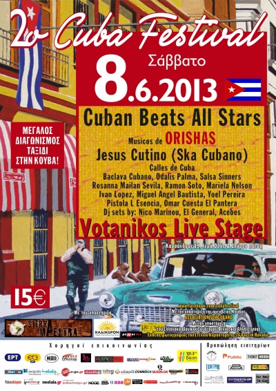 Ποικίλλα μουσικο – χορευτικά προ-φεστιβαλικά happenings, εικαστικές εκθέσεις, Video προβολές, Dj Sets και ένα σημαντικό αφιέρωμα σε ένα θρυλικό συγκρότημα, τους Orishas περιλαμβάνει στην «ατζέντα» του το 2ο CUBA FESTIVAL . Ένα Φεστιβάλ με…άρωμα Κούβας το οποίο φέτος πραγματοποιείται το Σάββατο 8 Ιουνίου στο ΒΟΤΑΝΙΚΟ Live Stage– ένα χώρο με μεγάλη ιστορία στη φιλοξενία μεγάλων συναυλιών, που τα τελευταία χρόνια περιλαμβάνουν, μεταξύ άλλων, τους Alpha Blondy, Parov Stellar και Νneka.