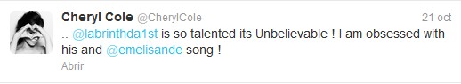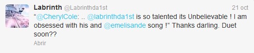 Η Cheryl έσπευσε στο twitter να εκφράσει τον θαυμασμό της για το νέο τραγούδι του Labrinth με την Emeli Sande και εκείνο που πήρε ως απάντηση ήταν μια πρόταση για ντουέτο. Λέτε τελικά αυτοί οι δυο να τα βρουν και να μας χαρίσουν άλλη μια υπέροχη συνεργασία?