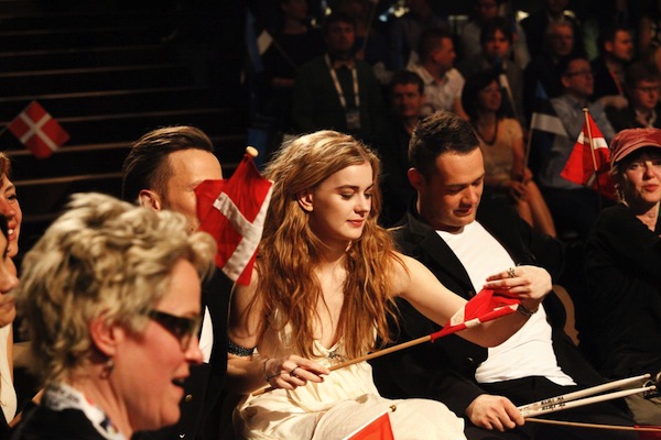 Η Emmelie De Forest από τη Δανία φτιάχνει τη σημαία της περιμένοντας να περάσει η ώρα για να ανακοινωθούν τα αποτελέσματα.
