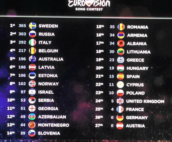 Η Ελλάδα τερμάτισε μόλις στην 19η θέση και η Κύπρος στην 22η με 23 και 11 πόντους αντίστοιχα. Αξίζει να σημειωθεί πως και οι δύο παρουσίες ήταν απόλυτα αξιοπρεπείς και ικανοποίησαν το κοινό. Πολλά συγχαρητήρια!