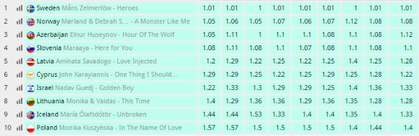 Οι Bookmakers δίνουν ως μεγάλα φαβορί όχι μόνο για τον ημιτελικό, αλλά και για τον τελικό τη Σουηδία, τη Νορβηγία, το Αζερμπαϊτζάν και τη Σλοβενία.