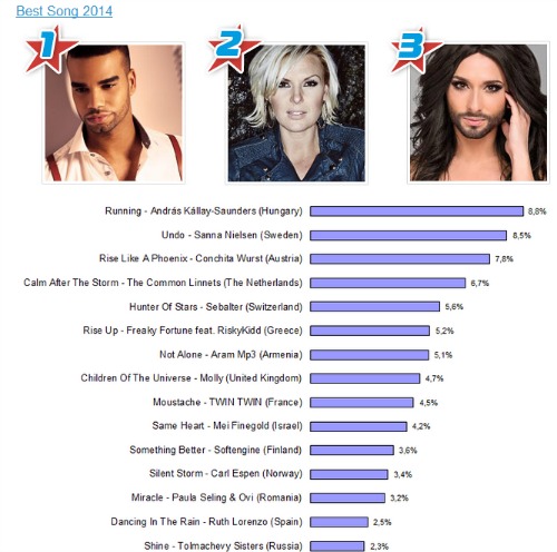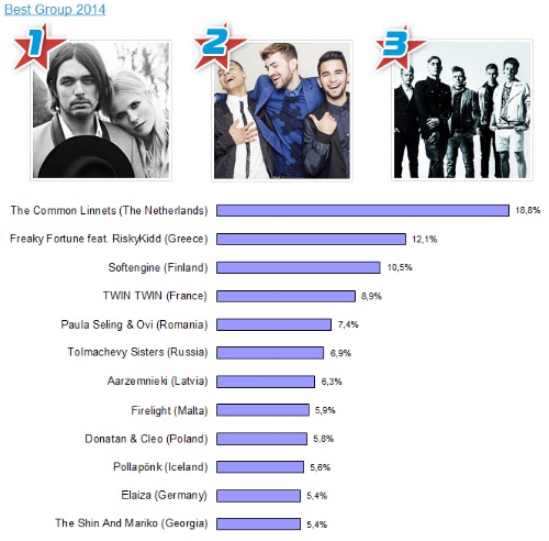 Μεγάλος νικητής των βραβείων αυτών ήταν ο András Kállay-Saunders, ο Ούγγρος καλλιτέχνης που θριάμβευσε στις κατηγορίες “Best Male Artist 2014” αλλά και “Best Song 2014”. Η Σουηδή Sanna Nielsen κέρδισε το “Best Female Artist 2014”, ενώ οι Ολλανδοί The Common Linnets κέρδισαν το βραβείο “Best Group 2014” μια θέση μπροστά από τους δικούς μας Freaky Fortune.