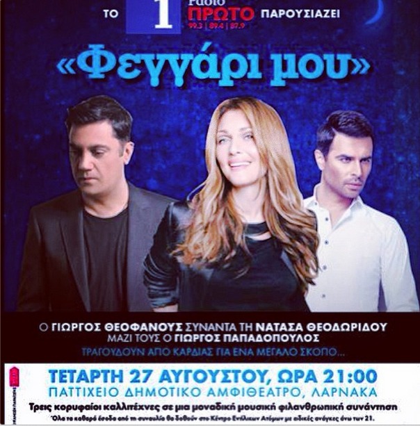 Οι τρεις καλλιτέχνες ενώνουν τις δυνάμεις τους για μια μεγάλη συναυλία με τίτλο “Φεγγάρι μου” στο Παττίχειο Δημοτικό Αμφιθέατρο της Λάρνακας στις 27 Αυγούστου. Στόχος της συναυλίας αυτής η συγκέντρωση χρημάτων για το Κέντρο ενηλίκων ατόμων με ειδικές ανάγκες άνω των 21 κι όλα τα έσοδα θα δοθούν καθαρά εκεί.