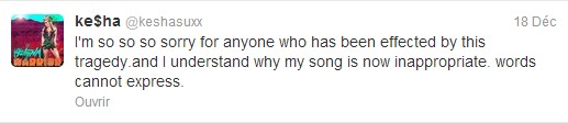 Λίγο αργότερα το tweet διαγράφηκε, προφανώς διότι ήταν ολίγον τι οξύμωρο λαμβάνοντας υπόψη ότι οι στίχοι του “Die Young” είναι γραμμένοι από την ίδια σε συνεργασία με τους Dr. Luke, Benny Blanco, Fun και Cirkut. Τη θέση του μυστήριου tweet πήρε το: «Λυπάμαι τόσο τόσο τόσο πολύ για οποιονδήποτε συνδέεται με αυτή τη τραγωδία. Και καταλαβαίνω γιατί το τραγούδι μου είναι πλέον ανάρμοστο. Τα λόγια δε μπορούν να το εκφράσουν.»
