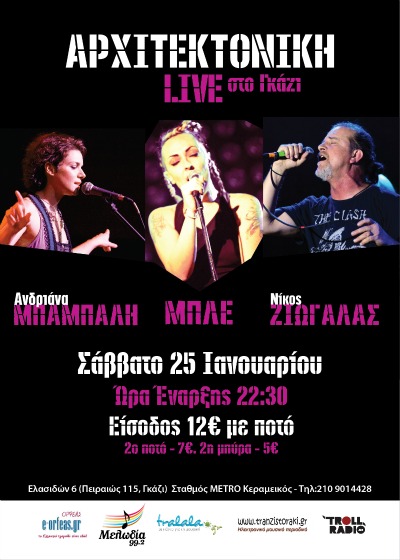 Οι Μπλε, η Ανδριάνα Μπάμπαλη και ο Νίκος Ζιώγαλας ένωσαν τις δυνάμεις τους και μετά από μια σειρά επιτυχημένων ενφανίσεων στη Θεσσαλονίκη έρχονται στην Αθήνα, το Σάββατο 25 Ιανουαρίου, στην Αρχιτεκτονική, για μια μοναδική συναυλία.