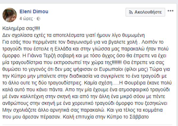 Με μία δημοσίευση στο facebook η Ελένη Δήμου σχολίασε τόσο την Ελληνική συμμετοχή όσο και την συμμετοχή της Κύπρου στη Eurovision 2018.