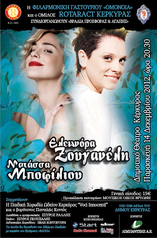 Βραδιά Προσφοράς και Aγάπης, στο Δημοτικό Θέατρο Κέρκυρας μαζί με τις τραγουδίστριες Νατάσσα Μποφίλιου και Ελεωνόρα Ζουγανέλη.