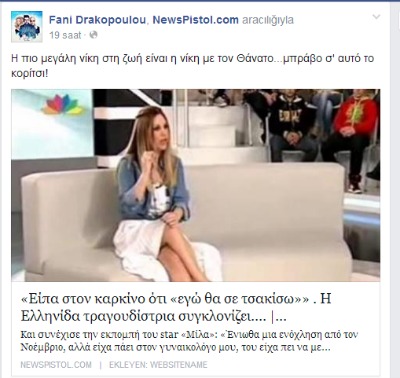 Η Φανή Δρακοπούλου συγχαίρει την Αγγελική Ζήκα δημόσια, μέσα από την προσωπική της σελίδα στο facebook.