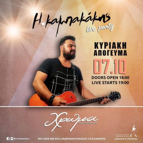 Από την Κυριακή 7 Οκτωβρίου και κάθε Κυριακή απόγευμα (οι πόρτες ανοίγουν στις 18.00) και από τις 19.00, το live party ξεκινά, με τον Ηλία Καμπακάκη, να φορτσάρει με τις μουσικές του και τις μεγάλες επιτυχίες του!