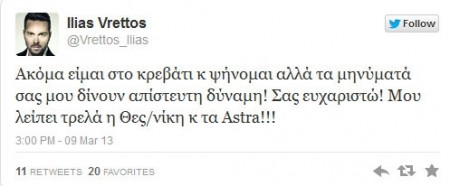 Εξαιτίας της ασθενείας που τον ταλαιπωρεί, ο Ηλίας Βρεττός δεν κατάφερε να βρεθεί στο πλευρό της Νατάσας Θεοδωρίδου στο νυχτερινό μαγαζί όπου εμφανίζονται. Ο τραγουδιστής τις τελευταίες μέρες ταλαιπωρείται από μια ίωση που τον αναγκάζει να απέχει από τις επαγγελματικές του υποχρεώσεις.