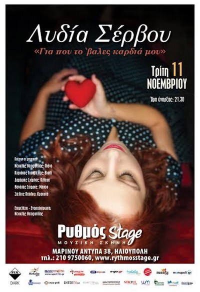 Λίγους μήνες μετά το επιτυχημένο πρώτο προσωπικό της live στον Ρυθμό Stage η Λυδία Σέρβου που είναι γνωστή ως «μωβ κορίτσι» λόγω της αδυναμίας της στο συγκεκριμένο χρώμα, επανέρχεται στον ίδιο χώρο την Τρίτη 11 Νοεμβρίου, αυτή τη φορά με ένα πρόγραμμα αλλιώτικο, ντυμένη σε εντονότερες αποχρώσεις και δυναμικότερη διάθεση. Η τραγουδίστρια που κυκλοφόρησε τον πρώτο προσωπικό της δίσκο με νανουρίσματα, συνέχισε τη μουσική διδασκαλία σε παιδιά, ενώ έκανε μετρημένες εμφανίσεις συνεργαζόμενη με αγαπημένους καλλιτέχνες, βρίσκεται και πάλι στη σκηνή του Ρυθμού μαζί με πέντε ξεχωριστούς μουσικούς για να παρουσιάσουν ένα πρόγραμμα με τραγούδια όλων των αισθήσεων…