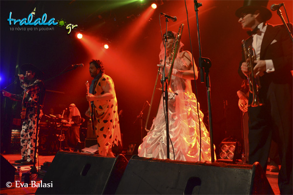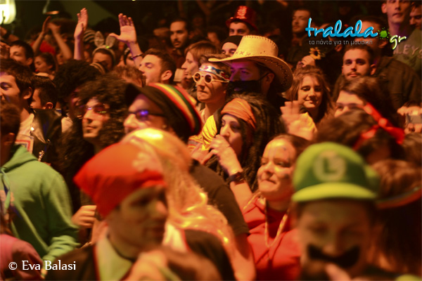Η Λιοσίων 205 θύμιζε παιδικό πάρτι. Παντού κονφετί και σερπαντίνες, σπρέι με αφρό και σπρέι με κορδόνια, και αμέτρητοι (πραγματικά πολύς κόσμος) μασκαράδες (ελάχιστοι σνόμπαραν το ‘μασκέ’ σκέλος του πάρτι). Το προσυναυλιακό mood είχε αναλάβει να το φτιάξει ο DJ Polly B με κλασικούς καρναβαλικούς ήχους διανθισμένους με καλοκαιρινές σφήνες μουσικής ανεμελιάς.