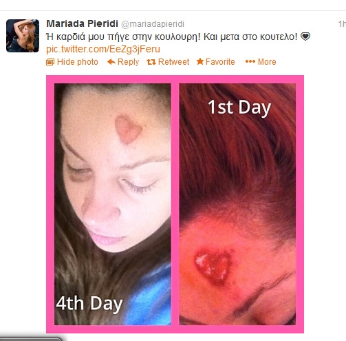 Αφού τους ευχαρίστησε όλους για τις ευχές και τα μηνύματα τους, στην συνέχεια χαριτολογώντας είπε: «Η καρδιά μου πήγε στην κούλουρη! Και μετά στο κούτελο!» καθώς στην φωτογραφία που “πόσταρε” φαίνεται το τραύμα στο κούτελο της, το οποίο είναι σε σχήμα καρδιάς.