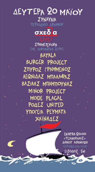 Το μουσικό ταξίδι που προγραμματίζουν η «Σχεδία» και η «Τεχνόπολις» Δήμου Αθηναίων παίρνει μια μικρή αναβολή. Αντί για την Πέμπτη 9 Μαΐου, η συναυλία θα πραγματοποιηθεί τη Δευτέρα 20 Μαΐου. Πάντα στο Γκάζι, πάντα με πολύ κέφι και αγάπη! Για τη συναυλία έχει οριστεί μια συμβολική τιμή εισόδου της τάξης των 5€. Όλα τα έσοδα θα διατεθούν για τις ανάγκες του περιοδικού δρόμου «σχεδία», αλλά και την υποστήριξη της καμπάνιας «Γκολ στη Φτώχεια» και τις ανάγκες της Εθνικής Ομάδας Ποδοσφαίρου Αστέγων, που αυτό τον καιρό προετοιμάζεται εντατικώς ενόψει της συμμετοχής της στο 11ο Παγκόσμιο Κύπελλο Αστέγων που θα διεξαχθεί το καλοκαίρι που μας έρχεται στο Πόζναν της Πολωνίας.